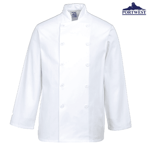 This chefs jacket is the ultimate in wearer comfort. The double-breasted front and rubber button features enhance the classic styling of this garment. The chef jacket is made from 100% premium cotton, it is absorbent and comfortable next to the skin.  Washable at 60 Degrees. Iron max 150°C.